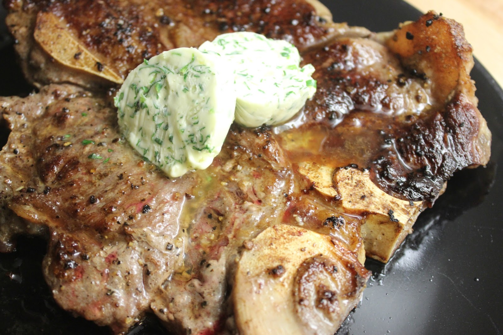Aiemmista ohjeista ainakin Kokkeillaan-blogin ja Sillä Sipulin pihveihin oli hierottu valkosipulia ja mausteita, ja ne oli paistettu pannulla. Makustelijat taas olivat testanneet sous vide -menetelmää ja viimeistelyä pannussa tasaisen kypsyyden saavuttamiseksi. Sellaiseen ei meillä kuitenkaan ollut välineitä, joten lähdin tekemään ihan tavallista pihviä pannulla. Otin lihan huoneenlämpöön jo noin tuntia ennen paistamista. Mausteet lisäsin vasta paistettuun lihaan, koska ajattelin niiden kärähtävän helposti pannuun kiinni. Sihisevän kuumalla rautapannulla paistossa mediumiksi meni n. 7 minuuttia, eli kolmen ja neljän minuutin välillä per puoli. Vähemmän ärhäkällä teflonpannullani olisin pitänyt vielä pari minuuttia pidempään. Paistossa luotin kuitenkin aikaa enemmän silmämääräiseen arvioon, juurikin siitä syystä, että pannut ovat erilaisia. Lihapala oli sen verran suuri, että se sai ruskistua molemmin puolin ihan kunnolla pinnasta, eikä silti ollut läpikypsä. Paistoaikojen kanssa varoiteltiin, että liha kypsyy usein epätasaisesti ja jää helposti luun läheltä raa’aksi. Meidän pihveissä ei sitä ongelmaa oikeastaan ollut, mutta ne painoivat reilut 400g kappale eli eivät olleet aivan suurimmasta päästä t-luupihviksi. Paksuutta en mitannut.