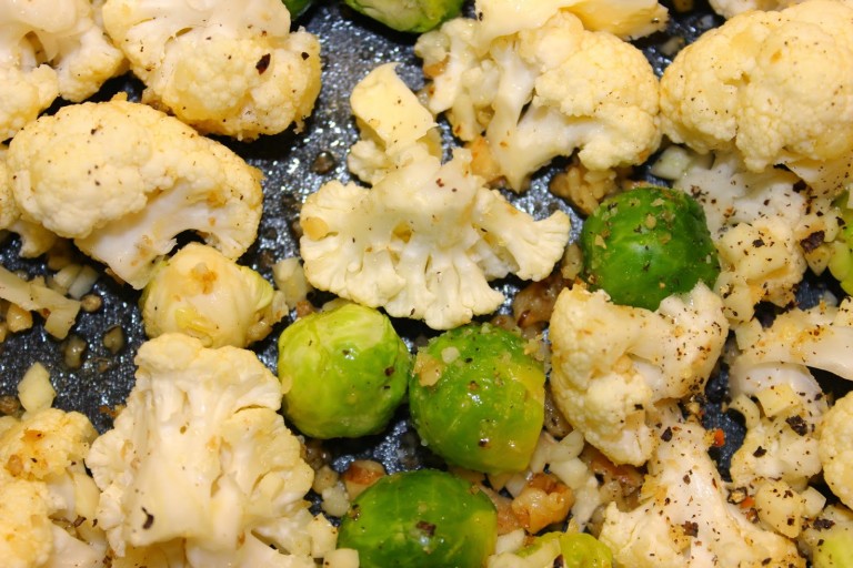 Ruusukaalin kaveriksi kaivoin jääkaapista vähän käytetyn kukkakaalin, jonka jämät pilkoin samaan uunivuokaan. Siinä muuten toinen kasvis, jonka syön yleensä aina samalla tavalla, höyrytettynä voin ja curryjauheen (jep) kera, eli korkea aika oli tuulettaa vähän kukkakaaliakin. Lopputuloksesta tulikin tosi hyvää, joskin olin onnistunut heittämään mukaan hiukan liikaa suolaa (ehkä se yksi hyppysellinen olisi ollut tarpeeksi kahden sijaan). Suolasta huolimatta paahdetut kaalit olivat oiva kaveri paistetuille porsaankyljyksille, muuta lisukettä ei kaivattu ja yksi arki-ilta oli jälleen pelastettu.