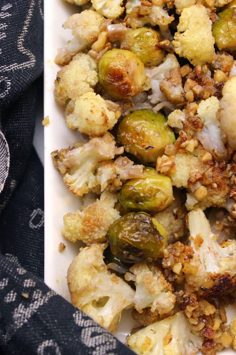 Leikkaa ruusukaalien kannat ja poista mahdolliset huonot päällilehdet, pilko kukkakaali pieniksi kukinnoiksi ja laita molemmat kaalit sikin sokin uunivuokaan. Murskaa morttelissa saksanpähkinät karkeaksi rouheeksi, kuori valkosipulinkynsi ja pilko samanmoiseksi rouheeksi. Ripottele nämäkin vuokaan. Lorauta päälle oliiviöljy, mausta suolalla ja pippurilla, sekoita ja vuole päälle muutama lastu voita. Paista 200-asteisessa uunissa n. 45 minuuttia.