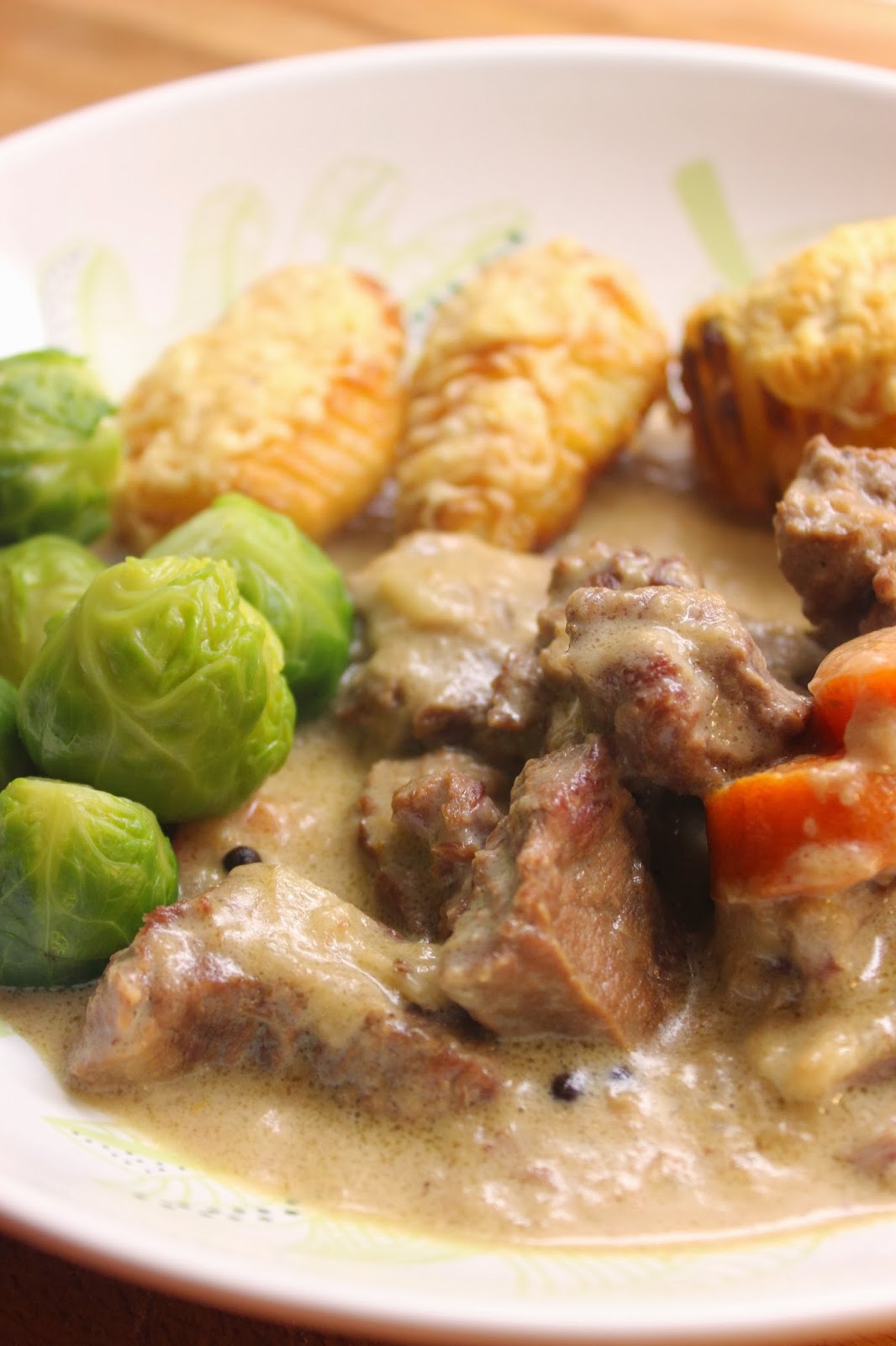 Palapaistista tuli oikein hyvää - hauduttelen usein hitaasti kypsennettäviä lihoja yön yli ja pelkäsin paistipalojen jäävän koviksi könteiksi tunnin-puolentoista haudutuksella, mutta kummasti ne vain ehtivät mureutua. Kehitysajatuksina, seuraavalla kerralla laittaisin kastikepohjaan hieman tummaa lihalientä ja saattaisin jättää kerman pois kokonaan tai ainakin vähentää sitä, jotta mausta tulisi vielä intensiivisempi. Allaoleva resepti kuitenkin sellaisena, kuin tällä kertaa tein. Paistamisen ja haudutuksen hoidin samassa kannellisessa pannussa, tällainen “yhden pannun metodi” toimi mielestäni hyvin ja sopi tiskausallergikolle ;)