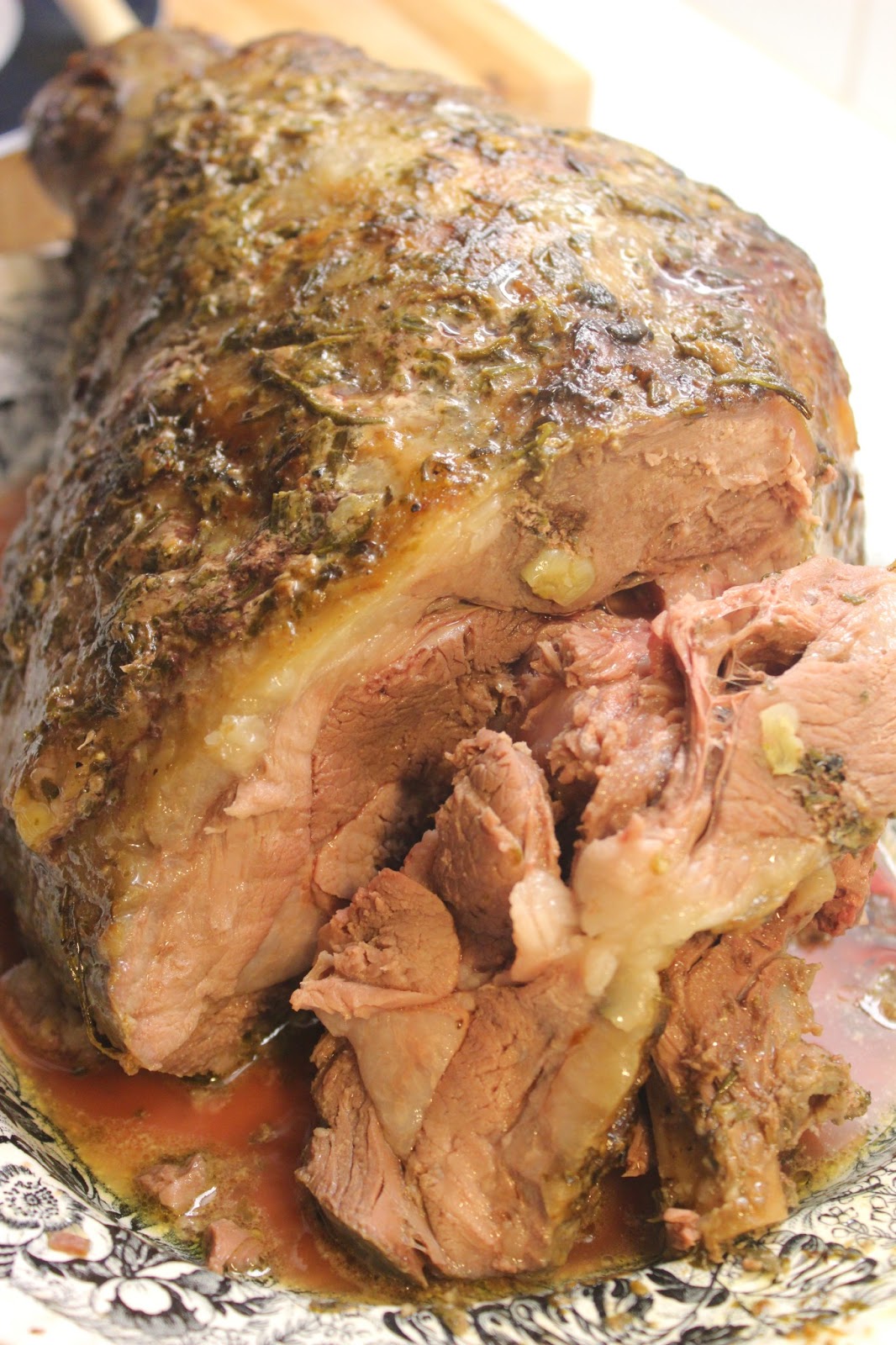 Tälläkään kertaa malttanut mennä reseptin mukaan, vaan marinoin lampaan jo etukäteen ja lyhensin hieman paistoaikaa, jolloin viulu jäi oman makuni mukaisesti pinkiksi sisältä. Käytin myös tuoreita yrttejä tahnan tekemiseen, ja shock horror, unohdin mintun kokonaan. Unohduksistani huolimatta lampaasta tuli maistuvaa, ja kolmen kilon viulusta riitti veisteltävää moneksi päiväksi :)