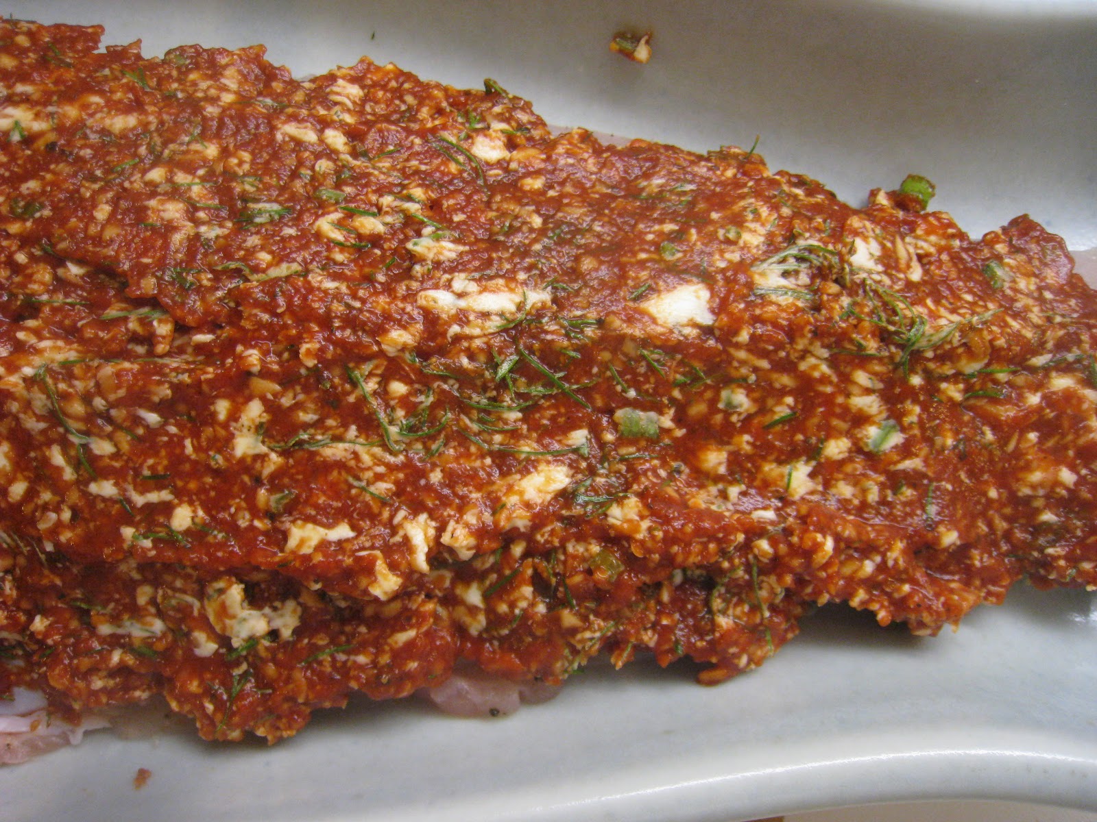 3. Laita uuni lämpiämään 180 asteeseen. Levitä kuorrute kalafileen päälle niin, että se peittää fileen parin sentin kerroksena. Jos kuorrutetta jää yli, se kannattaa lisätä korkeussuuntaan kalan päälle eikä ympärille, koska osa kuorrutteesta karkaa kalan päältä paiston aikana joka tapauksessa.