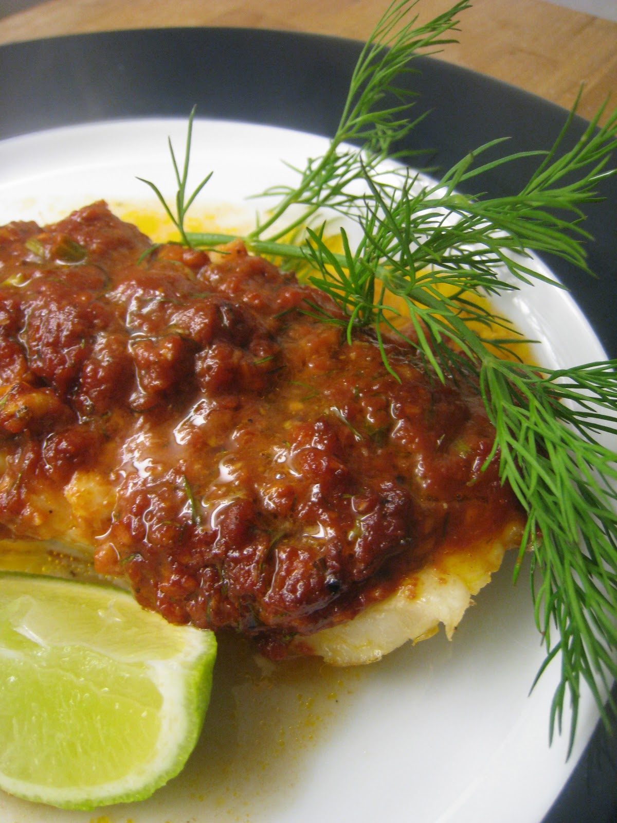 Takaisin kuitenkin reseptiin. Ohjeen juju on yhdistää piparjuuren ja tomaatin voimakkaat maut voin kanssa täyteläiseksi kuorrutteeksi, joka antaa runsaasti makua kalalle. Minun makuuni piparjuurta saa olla oikein kunnolla, niin, että se avaa tukkoiset nenät ;) Jos käytät tuubi- tai muuten säilöttyä piparjuurta, samasta määrästä tulee hieman maltillisempi maku. Lisäkkeenä olen tehnyt yleensä keitettyjä perunoita, kuorrute toimii samalla niiden kastikkeena. Ohjeesta riittää hyvin kolmelle, me söimme kaksin ja jonkin verran jäi vielä yli.