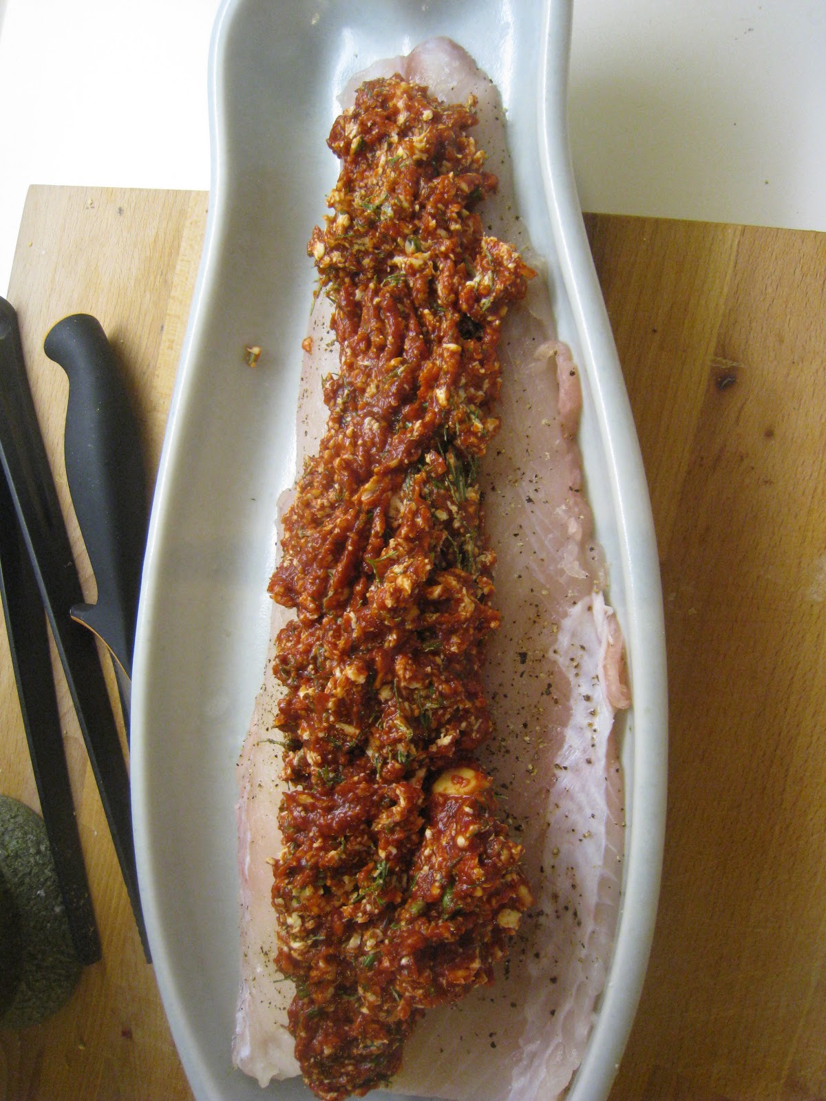 2. Sekoita kuorrutteeseen tarvittavat tomaattipyre, hieman pehmennyt voi, tilli, piparjuuri, sokeri, suola ja pippuri.