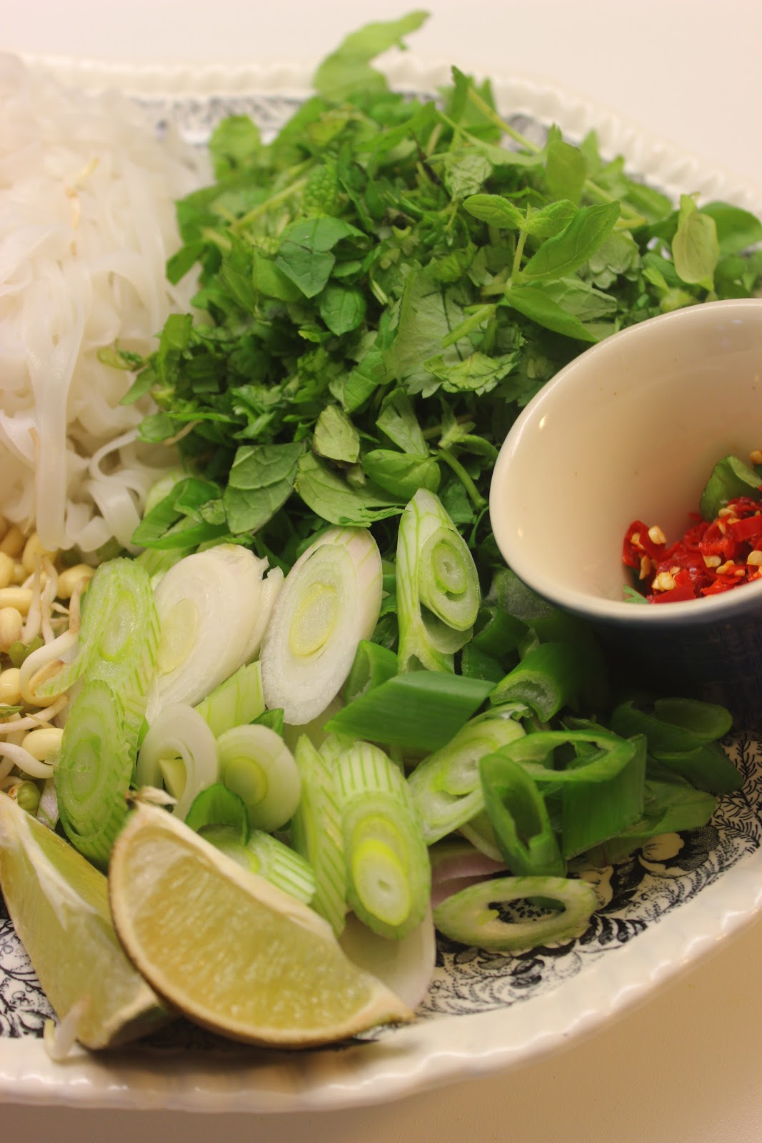 Minulla ei ole fonduepataa tai muuta sopivaa, millä keittäisin tee-se-itse sopan pöydässä, mutta tein jonkinlaisen välimallin ratkaisun: liemi ja lihat keitetään valmiiksi, ja loput aineet saa jokainen ruokailija (eli isäntä ja minä) annostella itse liemeen. Sopan ihanuus on siinä, että siihen voi kirjaimellisesti laittaa melkein mitä vaan. Hyvin toimi, ja hyvältä maistui, vihannekset ja yrtit eivät yhtään ehtineet kulahtaa vaan pysyivät raikkaina ja tuoreina.