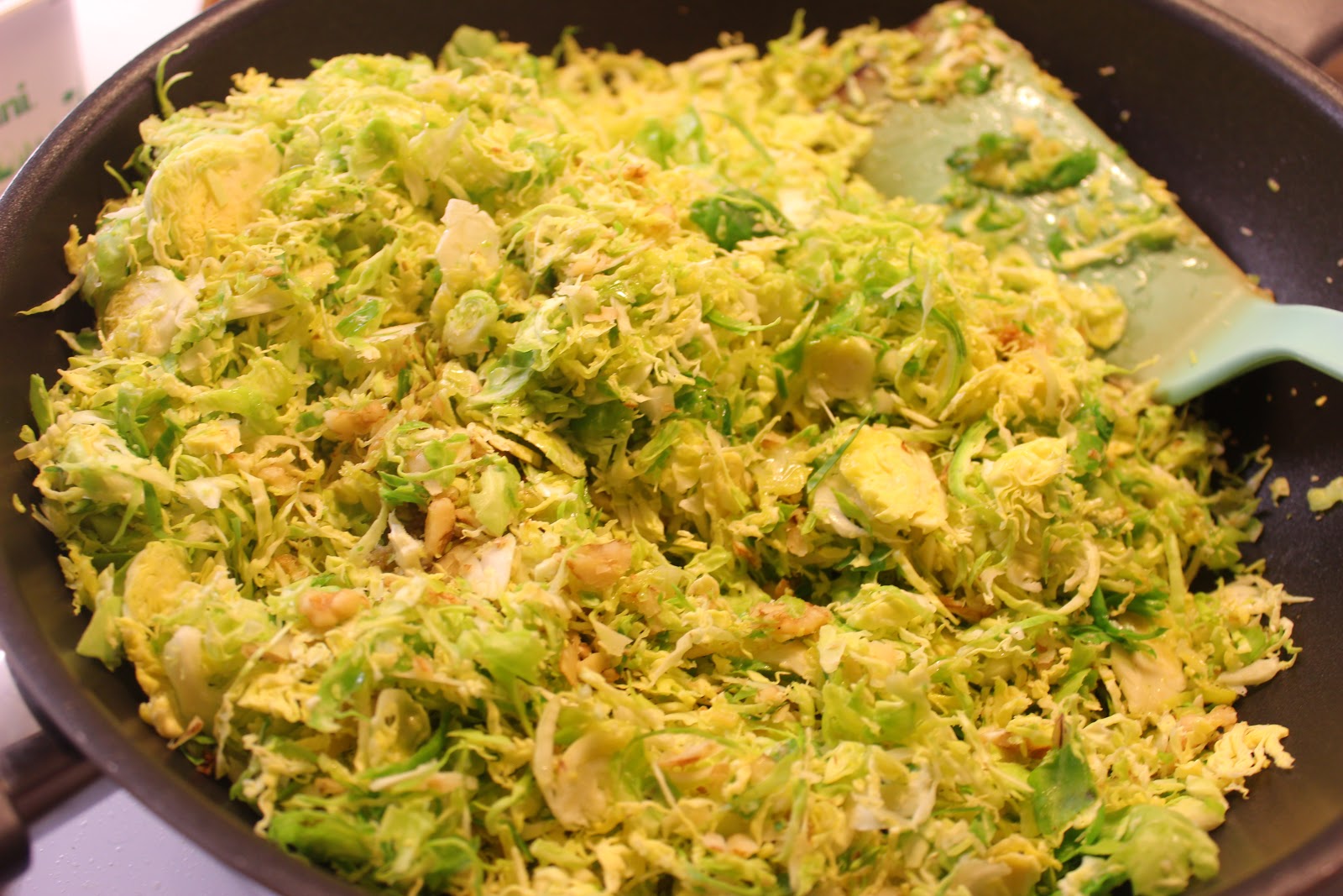 Surauta ruusukaalit ohueksi raasteeksi ja pähkinät rouheeksi monitomikoneessa. Lämmitä wokkipannu keskilämmölle, lorauta pannuun reilusti öljyä ja nakkaa sekaan ruusukaalihakkelus. Paista muutama minuutti sekoitellen. Lisää sitten vielä tilkka vettä sekä nokare voita, ja jatka kypsentämistä vielä muutama minuutti lisää, kunnes ruusukaalihakkelus on mehevän pehmeää, mutta rakenteessa on vielä vähän suutuntumaa. Mausta suolalla, pippurilla ja halutessasi sitruunamehulla.