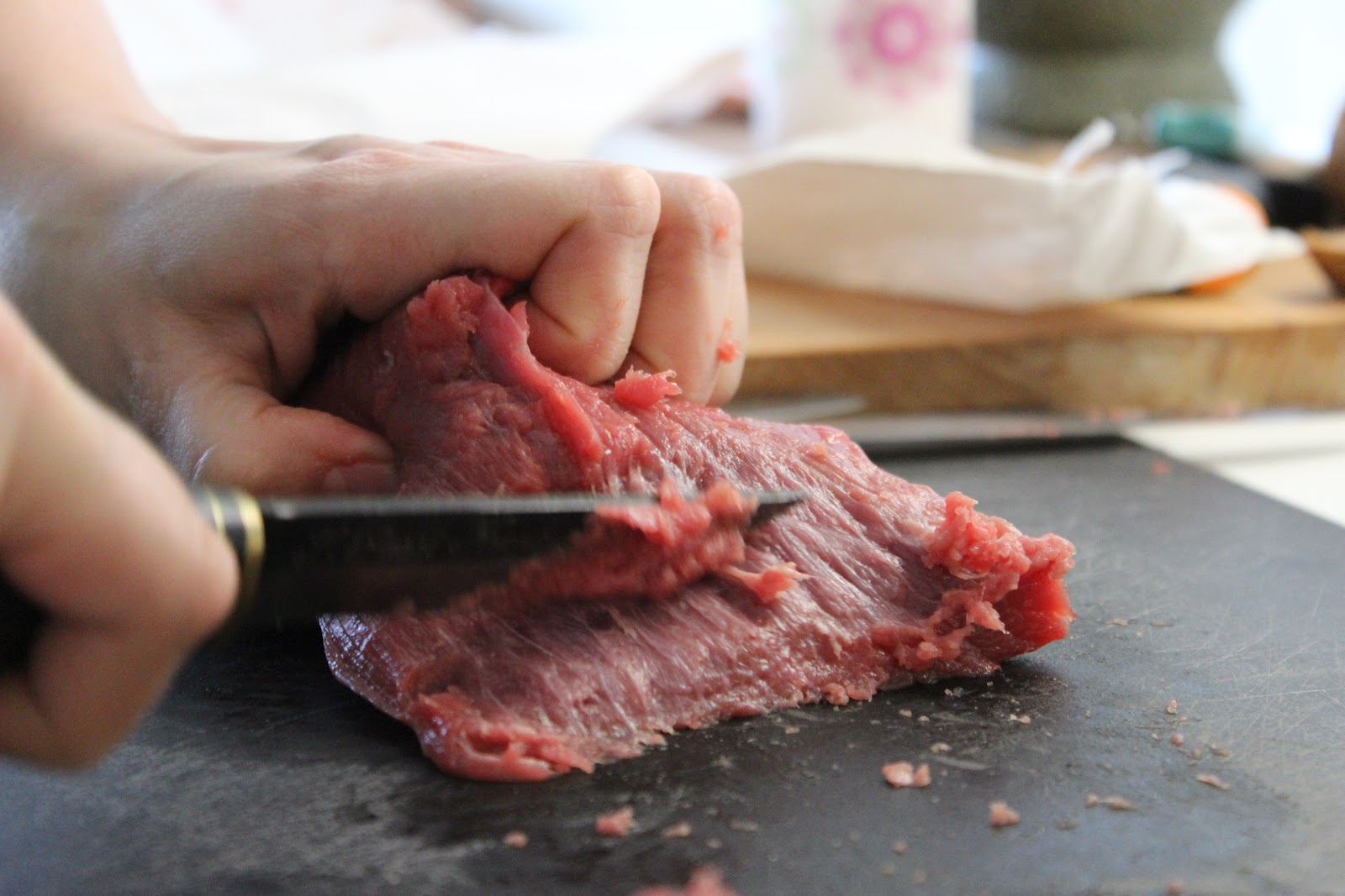1. Rapsuta terävällä, jämäkällä veitsellä liha paistista hienoksi massaksi (itse kokeilin läpi kaikki huushollin veitset, jonka jälkeen päädyin isännän ehdotuksesta puukkoon). Sekoita joukkoon suola ja pippuri. Maustamattomaan versioon ei juuri muuta tule, mutta mausteista versiota varten ota puolet lihasta eri astiaan.