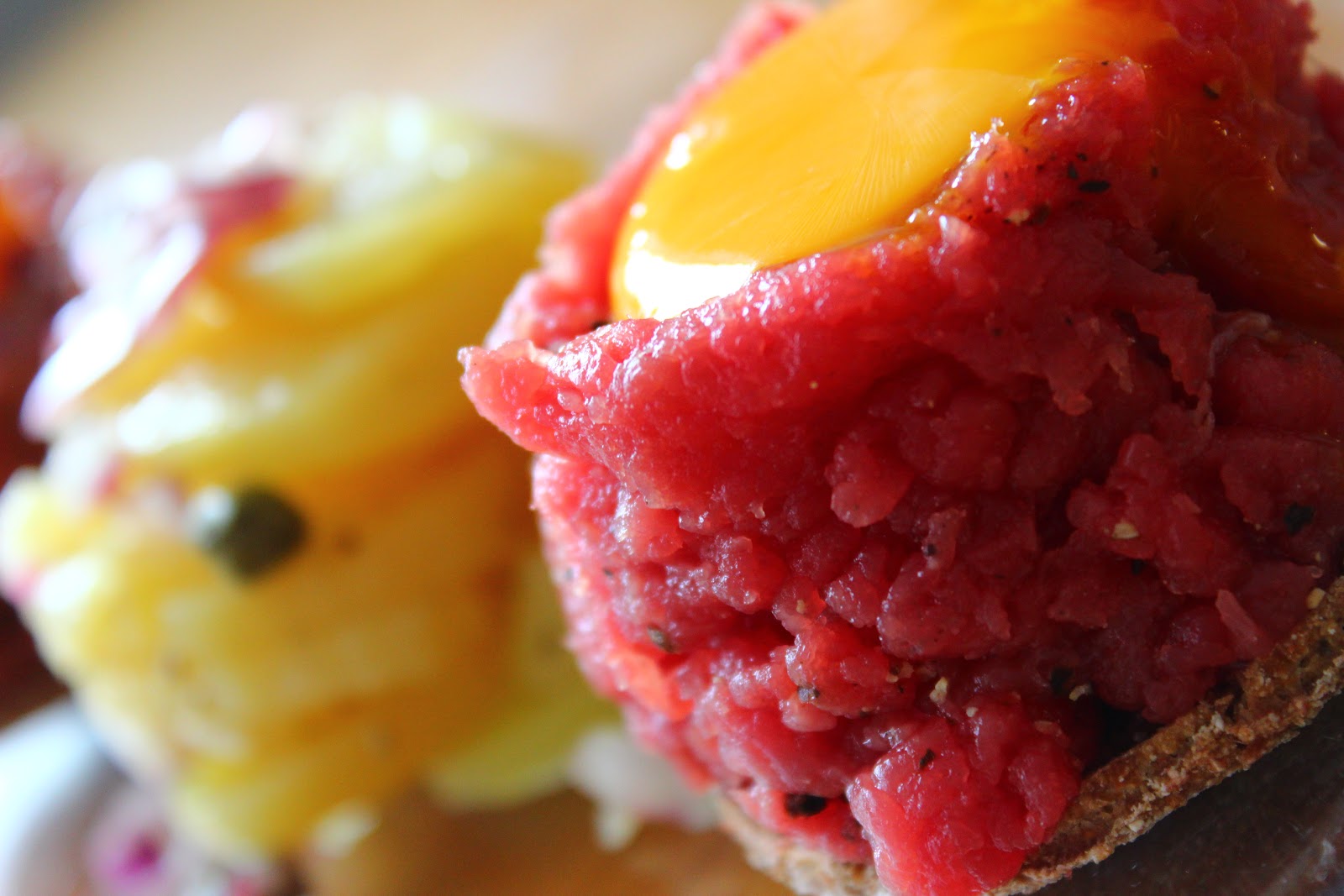 Yleensä olen ollut yksinkertaisten tartarpihvien ystävä (melkeinpä tyyliin “syö jauheliha suoraan paketista”), mutta nyt halusin testata myös versiota, missä mausteet sekoitetaan mukaan pihviin mm. Ankerias Vipusen ohjeen inspiroimana, siksi pihvit tuli tehtyä kahdella tavalla. Pihvien kanssa tarjoilin perunasalaatin lisäksi keltuaista, kapriksia, punajuuri- ja suolakurkkukuutioita sekä hienoksi hakattua punasipulia.