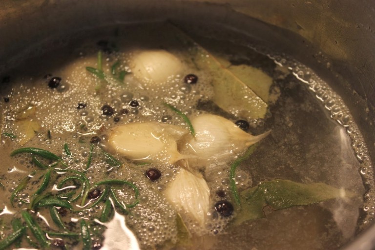 2. Lihan kypsyessä sekoita mausteliemen ainekset kattilassa, kiehauta, kunnes suola ja sokeri sulavat, ja jäähdytä.