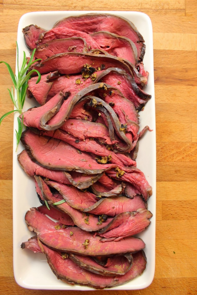 3. Ota paisti uunista, kun mittari näyttää 60-70 astetta (haluamastasi kypsyysasteesta riippuen). Laita paisti mausteliemeen (minä laitoin paistin ja liemen pussiin) ja anna maustua jääkaapissa vielä toiset 8-10 tuntia. Valuta paisti ja pyyhi kuivaksi ennen tarjoilua.