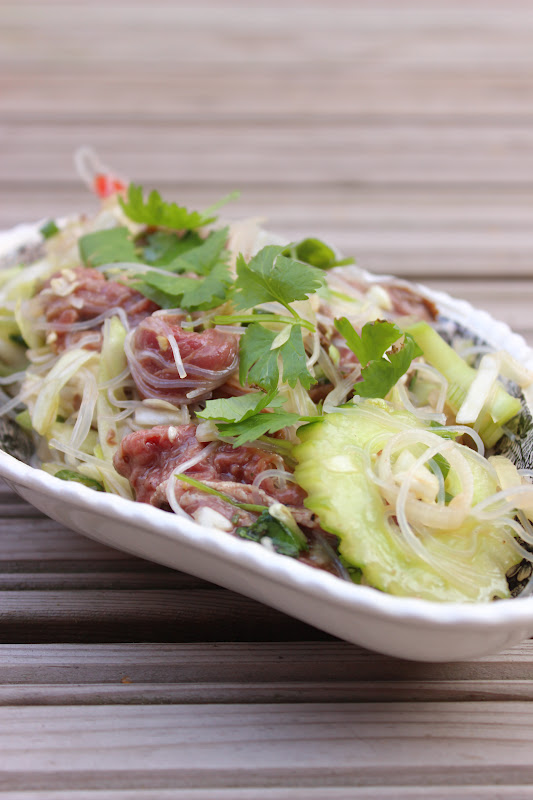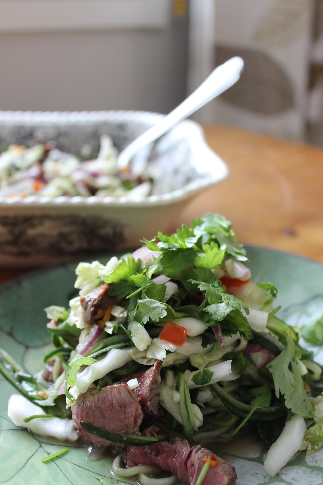 Ruokaisampiakin talvisalaatteja löytyy. Couscousista saa kivan kylmän tai lämpimän pohjan ympäri vuoden, ja proteiinit yhdistyvät myös rouskuvampiin salaattipohjiin, kuten lohi tässä jälleen kerran Aasiasta muistuttavassa salaatissa. Muita ruokaisia, saman maanosan salaatteja ovat esimerkiksi erilaiset naudanlihasalaatit, joita on tehty Kärähtäneiden keittiössä kerran jos toisenkin. Hyvin maustettu kastike pitää huolen, etteivät kurkut ja tomaatit mene turhan pliisuksi. Vähän toisenlaista naudanlihasalaattia taas teimme jouluna, se oli kevyempää mutta maut sopivat mukavasti talveen.