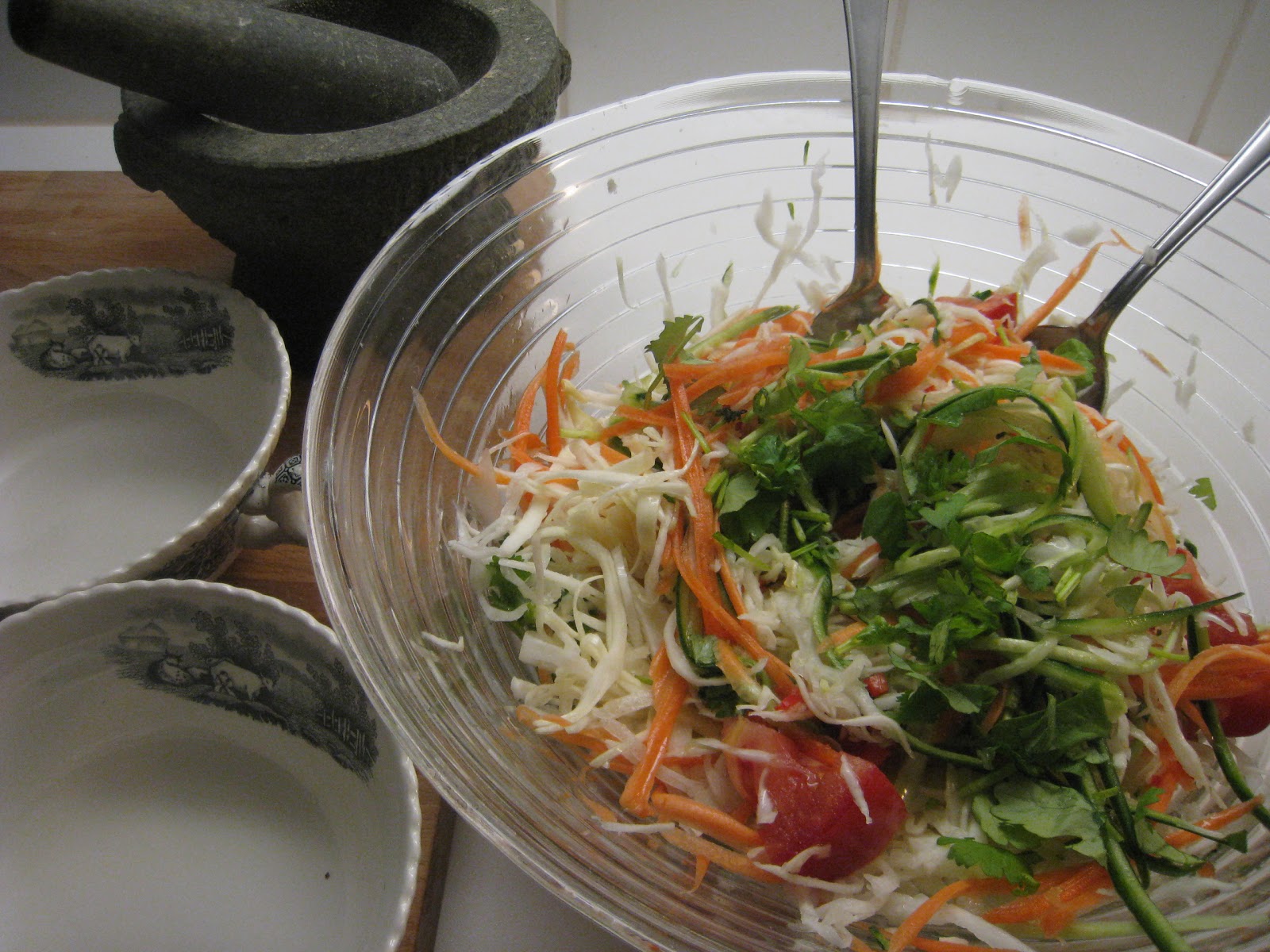 Kaalista saa rouskuvaa salaattia kesät talvet. Kaalipohjainen ikisuosikkini on tämä vale-papaijasalaatti eli aasialaistyyppinen salaatti, jossa kaalista, porkkanasta ja muista aineksista vielä piestään mehut esiin yhdessä happamanmakean limettikastikkeen kanssa. Hakkaamismetodi - mikä gastronominen termi muuten :D - tuo kaalin mehevyyttä esiin muissakin salaateissa. Jos et raaski kaalia piestä, niin kannattaa antaa sen kuitenkin levähtää hetki kastikkeen lisäämisen jälkeen, niin mehevyys pääsee paremmin oikeuksiinsa.