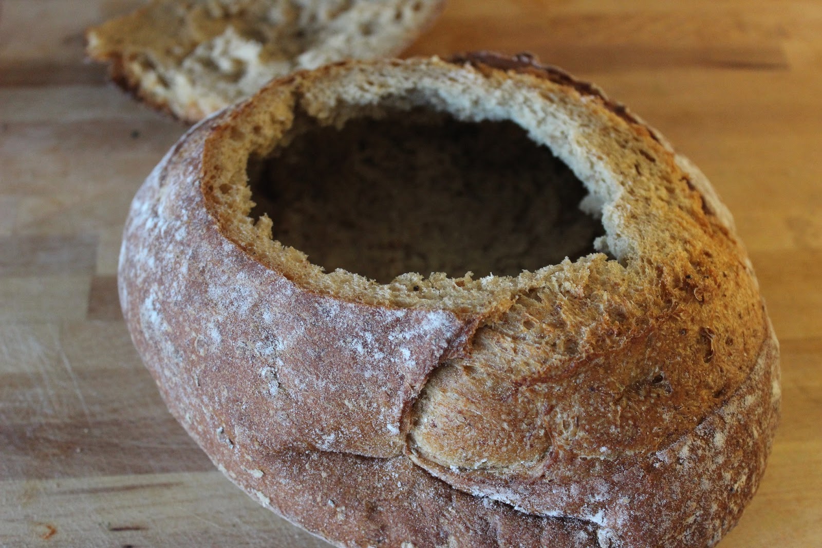 2. Leikkaa leivästä päälliosa, “kansi” pois ja koverra sisus tyhjäksi. Valele liemi lusikalla kostukkeeksi samalla leipää käännellen niin, että kostuke tarttuu siihen kauttaaltaan.