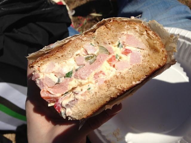 Muistatteko shooter’s sandwichin, jonka arvelin löytävän paikkansa myös tämän kesän piknikeväissä (onhan vappuna toki jo kesä)? Ennustukseni osui sikäli oikeaan, että tein leivästä version heti kauden ensimmäiselle piknikille. Alkuperäisen, lihaisamman vedoksen sijaan lähdin hakemaan voileipäkakuille tyypillisiä makuja; tuorejuustoa, majoneesia, kinkkua, maksamakkaraa, paprikaa, maustekurkkua ja juustoraastetta. Lopputuloksesta tulikin sitten enemmän eräänlainen sisäänrakennettu voileipäkakku kuin se alkuperäinen ampujanleipä.