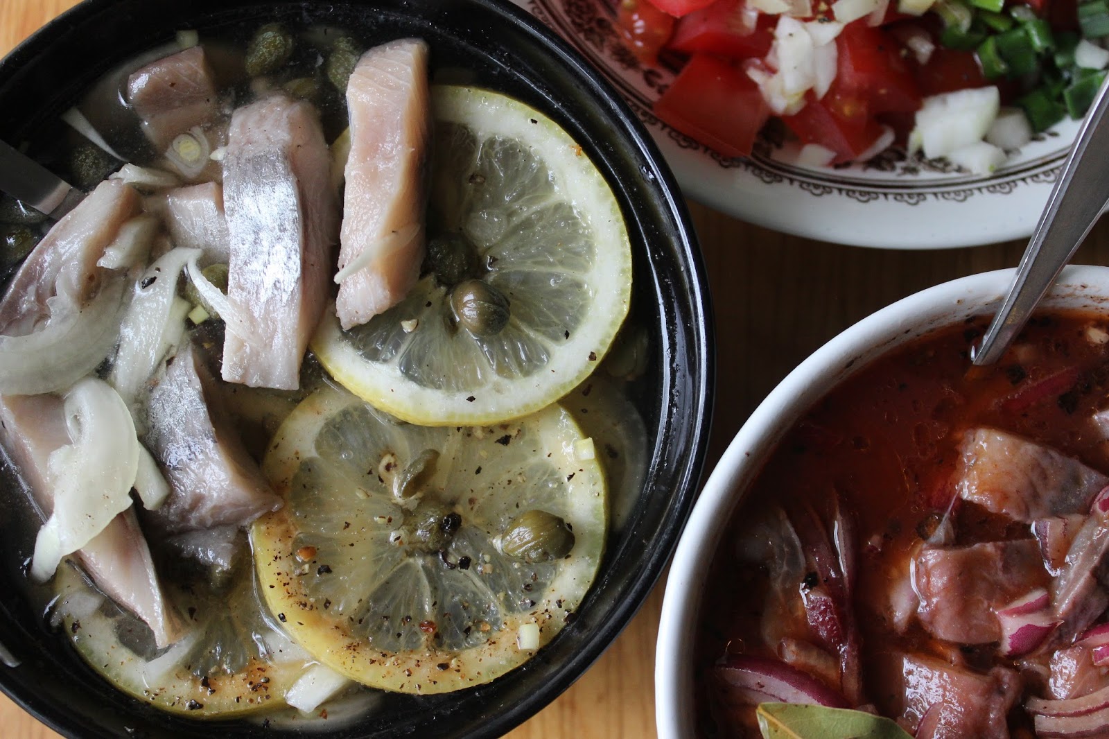 Sherrysillin lisäksi tein toisenkin sillikokeilun viime viikonlopun kalapöytään, ja laitoin kevytsuolattuja fileitä marinoitumaan ikisuosikkieni sitruunan ja kapristen kanssa. Ilokseni tälläkin tapaa valmistetusta sillistä tuli todella hyvää ja raikasta, joten molemmat uudet sillireseptit pääsevät meillä varmaan vakiorepertuaariin. Kunhan pääsen eroon pötsiliitännäisistä ruokarajoitteista, taidan kokeilla jotain samantapaista myös silakoille.