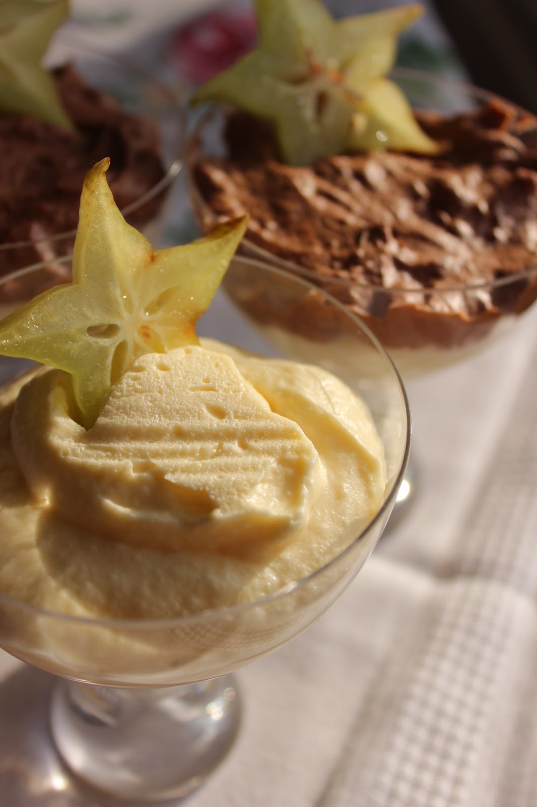 Jälkkäristä halusin keväistä, mutta toisaalta suklaatakin teki mieli. Suklaamousse on muutamana pääsiäisenä syöty helppo herkku, jonka pohjalta syntyi nyt ajatus kokeilla tehdä myös sitruunaista moussea lemon curdia käyttäen. Myönnettäköön, että mitään hajua ei ollut siitä, miten lemon curd käyttäytyy moussea tehdessä ja olisiko lopputuloksena juoksettunut litku, mutta sehän ei tietenkään estänyt kokeilemasta ;) Ja kannatti kokeillakin, sillä moussesta tuli todella hyvää, keväisen raikasta ja väriltään hennon keltaista, juuri pääsiäiseen sopivaa! Paritin sitruunamoussen tarjolle suklaisen serkkunsa kanssa, ja yhdistelmä toimi mainiosti - sitruunamousse oli makeankirpeää, ja suklaamousse taas hyvin täyteläistä, mutta ei erityisen makeaa, joten maut tasapainottivat toisiaan kivasti.