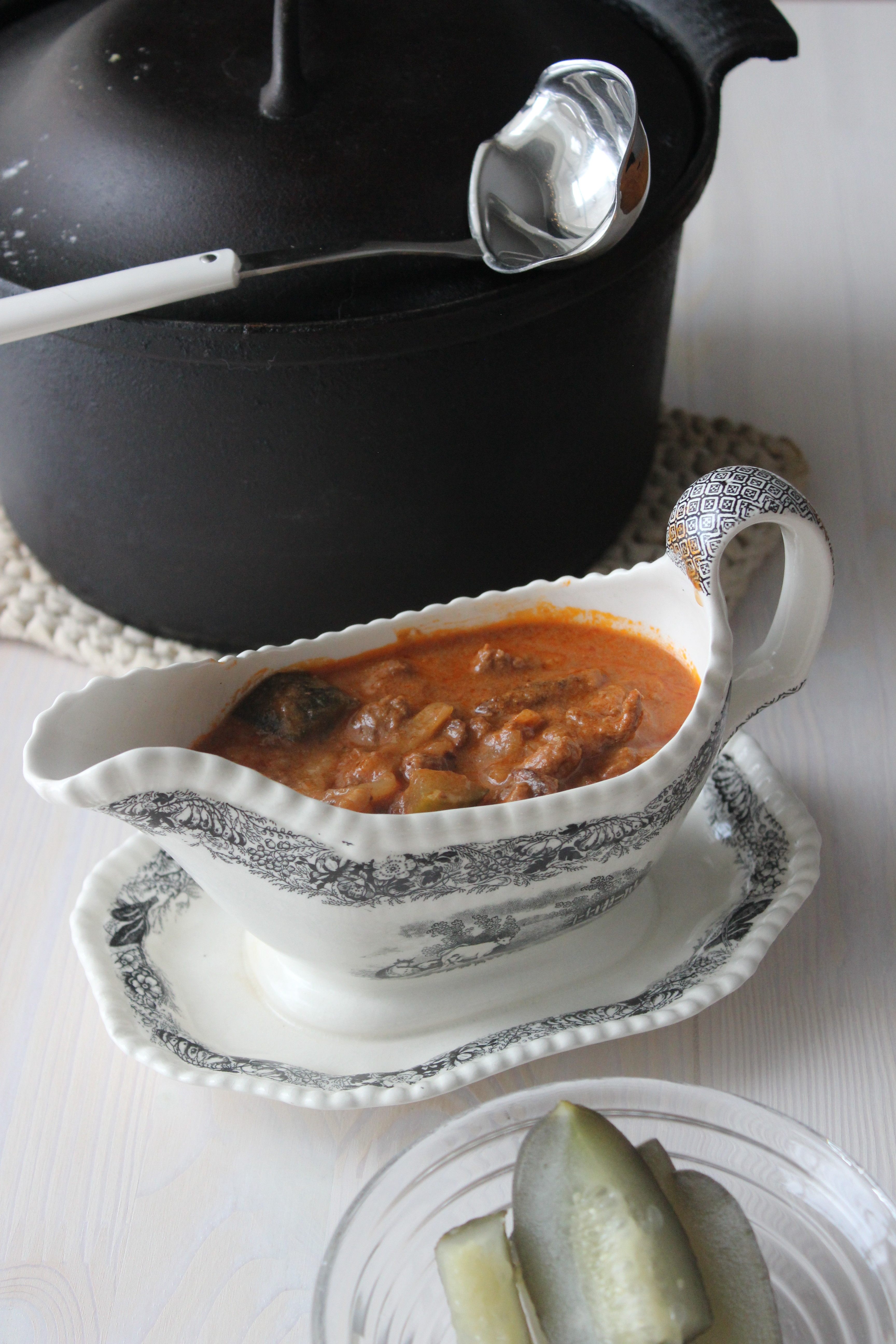 Laskiaiseen kuuluu perinteen mukaan tukeva ruoka ennen paastoon laskeutumista. Sellainen on tämä naudanlihastroganoff, jossa ei säästellä voita eikä smetanaa. Stroganoffilla on sikäli hieman huono maine, että maustekurkkukuutioita minkä tahansa kastikkeen seassa käytetään monesti tekosyynä kutsua mitä karmeimpia sotkuja stroganoffiksi (tai nakkistroganoffiksi, jos kurkulla jatketaan nakkikastiketta), mutta tämä rautapadassa hautunut herkku ei ole sellaista nähnytkään. Hienoinen pettymys stroganoff kuitenkin oli: maku oli herkullinen, mutta toivomaani ruokaprojektia en siitä onnistunut saamaan. Yritin nimittäin googlata stroganoffin salaisuutta, jotain yhdistävää ainesosaa tai metodia, jonka avulla voisin sanoa tehneeni ruuasta mahdollisimman autenttisen version. Kävi kuitenkin ilmi, että tämänkin ruuan ohjeita on yhtä monta kuin kokkejakin, eikä edes stroganoffin tavaramerkkinä pitämääni suolakurkkua kuulunut jokaiseen reseptiin. Noh, myönnän, että yhteisenä piirteenä stroganoff-resepteissä käytettiin yleensä vähintään paistia, jopa filettä - jota en itse koskaan kehtaisi laittaa pataruokaan- kun taas minulla oli käytettävissäni ylämaankarjan lihasuikaletta, joka arvatenkaan ei ollut peräisin arvopalasta. Allaolevaa ohjetta voi siis kuvailla minun näkemyksekseni stroganoffista, vaikea arvioida, kuinka autenttista siitä tuli. Rakkaudella valmistettua ja lämmittävän hyvää siitä tuli joka tapauksessa. ...