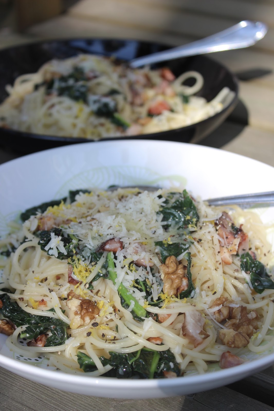 Onko mustakaali jo tuttu? Viime vuosina huippusuosiota nauttineen lehtikaalin ja savoijinkaalin välimuotoa löytyi meiltä kaupasta lehtikaalin sijaan, enkä voinut vastustaa kokeilua. Sattui myös mukavasti, että ostin pari päivää myöhemmin ensimmäistä kertaa Lantliv mat & vin -lehden irtonumeron (5/2015). Tykkäsin lehdestä kovasti ja korvamerkkasinkin siitä jo noin puolet resepteistä, mutta sopivasti sivuilta löytyi myös ohje mustakaalipastalle. Pasta on meillä arkiruokaa, johon ei ole tapana käyttää reseptejä, mutta tuollaisen täsmäohjeen tullessa vastaan niin sopivasti, oli sitä kokeiltava. Kolmas mukava sattuma oli se, että pastan kaikki ainekset löytyivät kotoa valmiina. Eli kohtalokin selvästi saneli, että mustakaalin on päädyttävä pastaan. ...