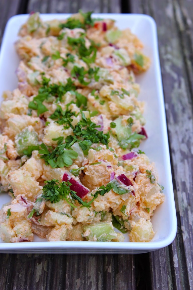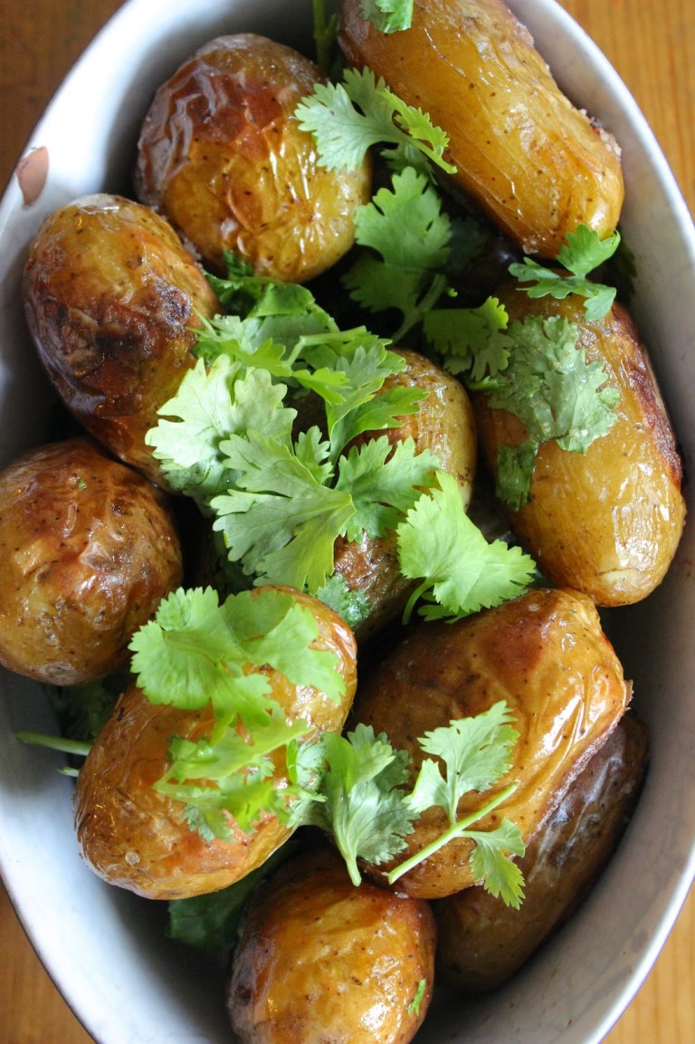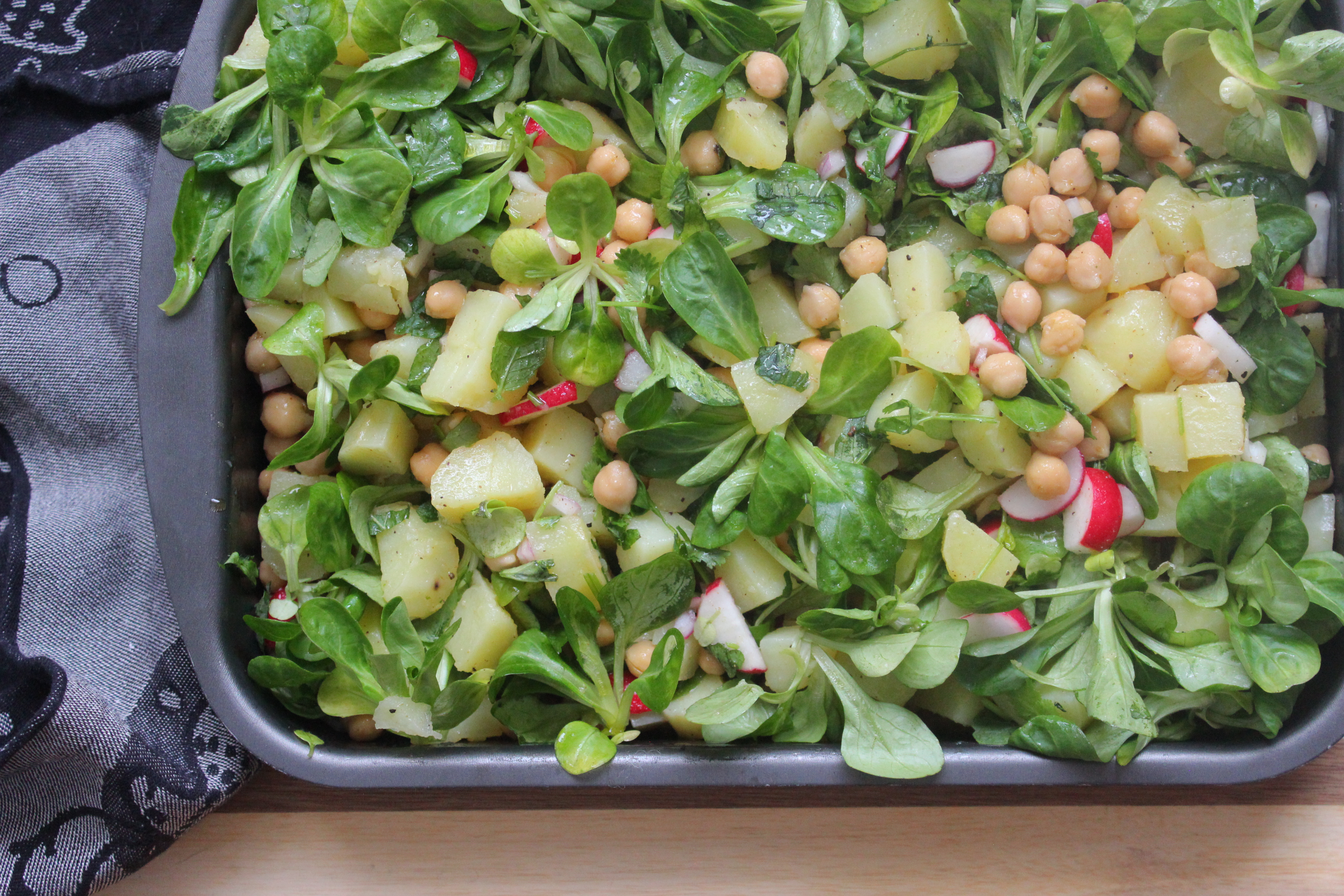 Mitä lähemmäs pääsiäistä edetään, sitä enemmän mieleni vaeltaa itäisen Välimeren ja Lähi-idän makujen pariin. Juustokumina, kaneli, sumakki, tahini, yrtit ja muut vaan sopivat niin täydellisesti kevääseen. Samaiset maut saattelevat kestosuosikki perunasalaatinkin ihan uuteen uskoon. Älä harhaudu kuvittelemaan, että perunasta saa vain tylsää ja tunkkaista ruokaa - runsain yrtein höystetty, rapean rouskuva salaatti pursuaa raikkautta ja makua. Kikherneet tuovat muutenkin täyttävään salaattiin niin paljon ruokaisuutta, että se menee hyvin ihan sellaisenaan lounaaksi tai päivälliseksi. Salaatin ainut miinus on, että ihan käden käänteessä se ei valmistu pilkkomisineen ja keittämisineen, mutta toisaalta, kylmänä syötävänä sen voi valmistaa etukäteen, maut vain paranevat yön yli levätessään. Salaatinkastikkeen makumaailman olen lainannut Ottolenghin kikhernesalaatista, ei liene yllätys, että se maistuu hyvältä perunasalaatissakin. Ihan täydellistä myös pääsiäisen juhlapöydässä! ...