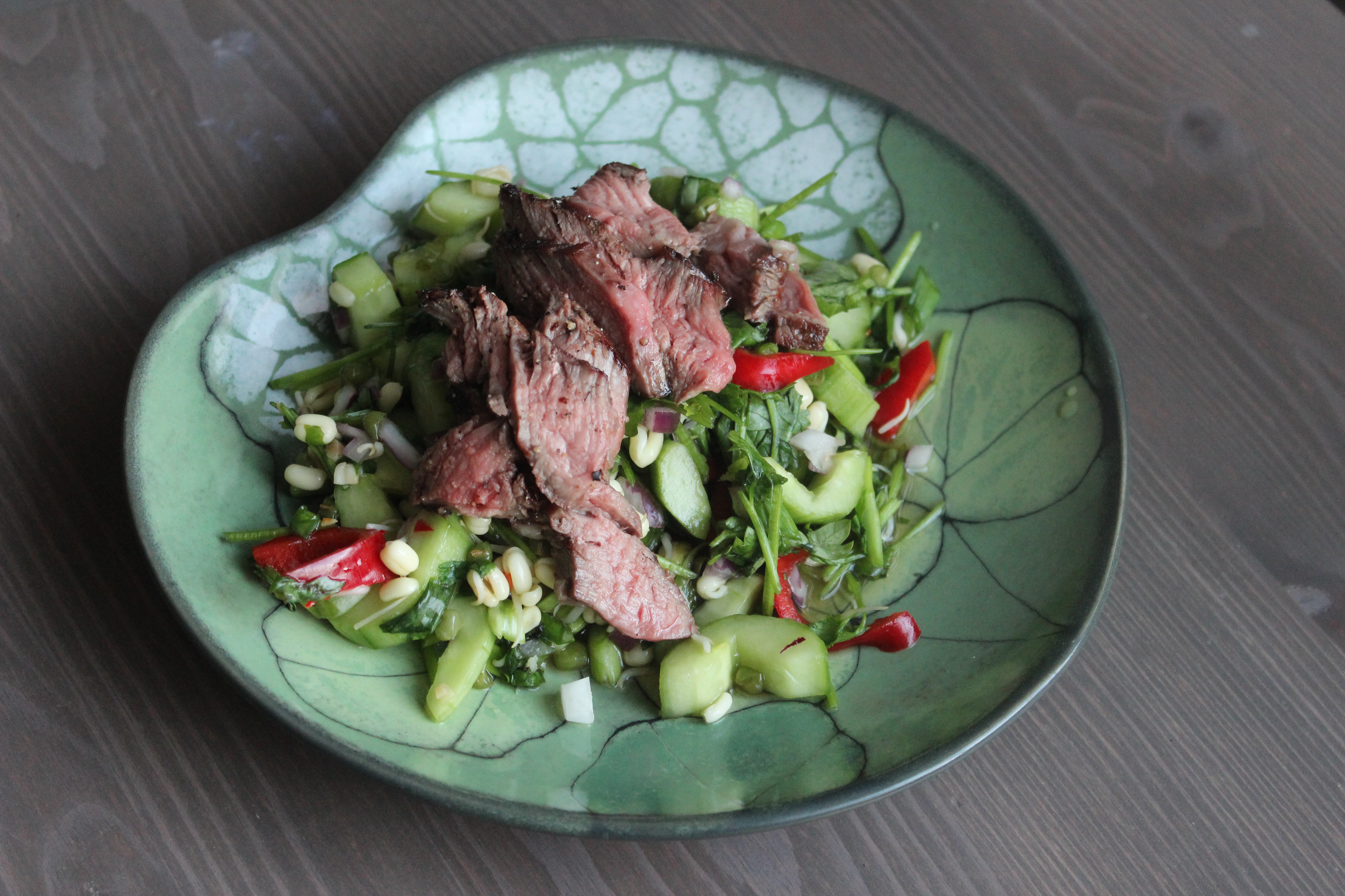 Jos yhdistää kaksi tavattoman hyvää asiaa, thai-maustetun salaatin ja grillatun entrecoten, niin eihän siitä voi tulla kuin vielä parempaa. Voisin lähestulkoon elää erilaisilla aasialaistyylisillä salaateilla ja thai-naudanlihasalaatista on tullut tehtyä versio jos toinenkin, mutta herkullisimmillaan se on varmasti juuri grillatun lihan kanssa. Tällä kertaa helppo ja nopea ruoka pelasti erään väsyneen arki-illan, mutta sopii hyvin myös viikonloppuun, jos et ole aikeissa käyttää koko päivää ruoanlaittoon. Lisuketta kaipaavalle salaatin kaveriksi sopii hyvin höyrytetty jasmiiniriisi. ...