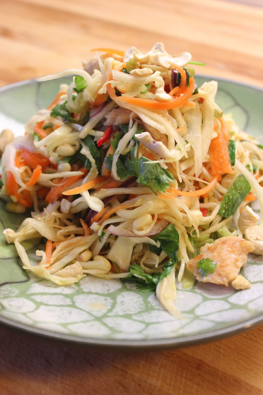 Menin hyvin pitkälti alkuperäisen ohjeen mukaan, joten en julkaise sitä erikseen, vaan suosittelen tarkistamaan sen täältä. Sen verran muuttelin, että jätin pois kiinankaalin (unohtui), lisäsin ituja ja tuoretta minttua, ja lopuksi vielä yhden ekstralimetin mehun, kun kaipasin lisää hapokkuutta. Maapähkinöiden sijaan käytin casheweita, kun meillä sellaisia sattui olemaan. Lopputuloksesta tuli makuuni hieman liian makeaa suhteessa salaatin hapokkuuteen (eli jatkossa lisää limettiä vaan), mutta kuitenkin ihanan raikasta ja keväisen tuoretta, joten tästä ohjeesta poikii varmaan lukuisia versioita varioitavaksi :)