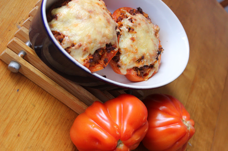 3. Täytä tomaatit riisi-jauhelihaseoksella. Laita päälle juustoraaste tai viipaleet. Paista uunissa 180 asteessa n. 30 min.