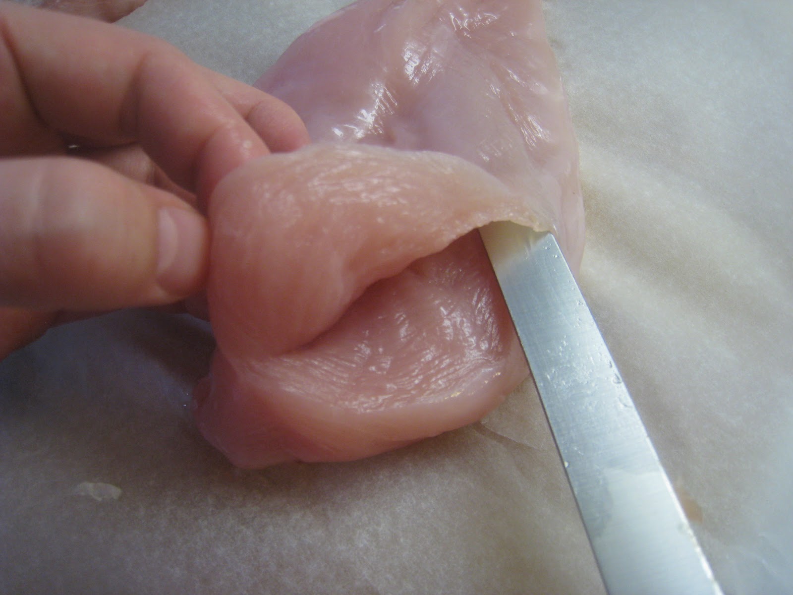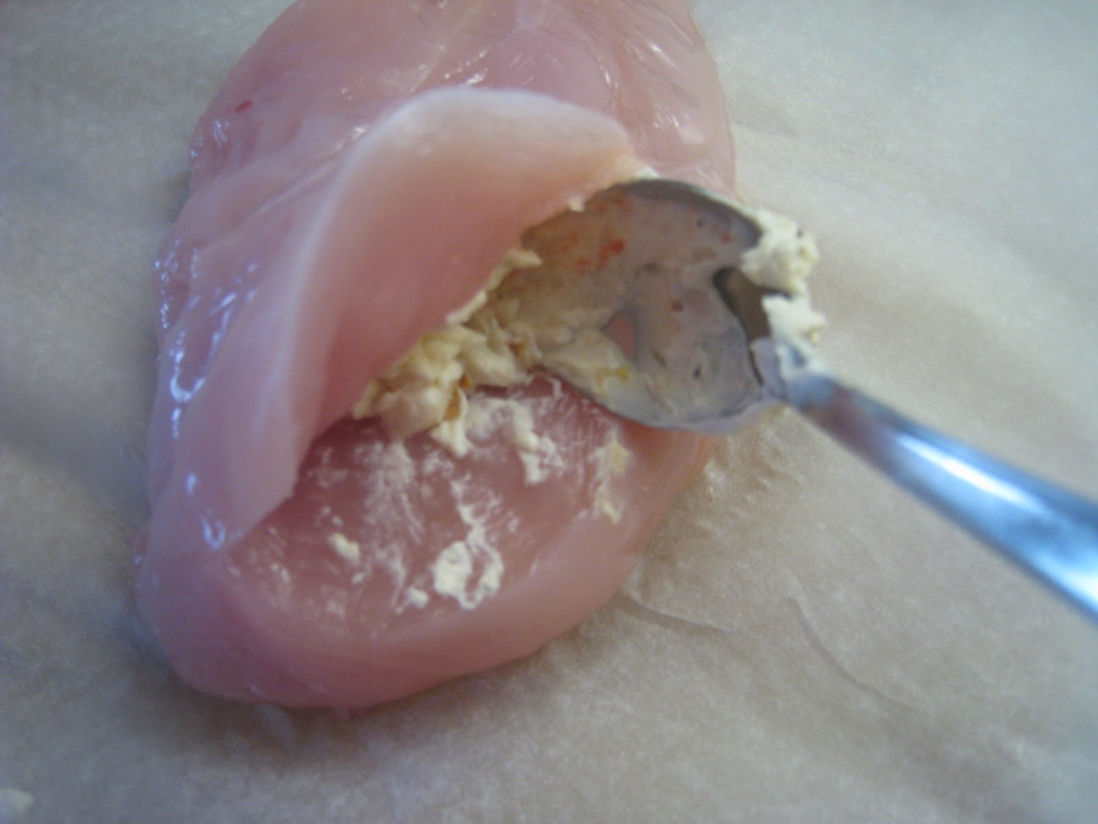 2. Leikkaa terävällä veitsellä fileisiin syvä, kapea tasku. Täytä taskut tuorejuustoseoksella kapeakärkistä lusikkaa apuna käyttäen (minä käytin greippilusikkaa). Jos maltat jäähdyttää täytteen kunnolla tai laittaa sen hetkeksi pakkaseen, on täyttäminen helpompaa. Mausta täytetyt fileet molemmin puolin suolalla ja pippurilla.