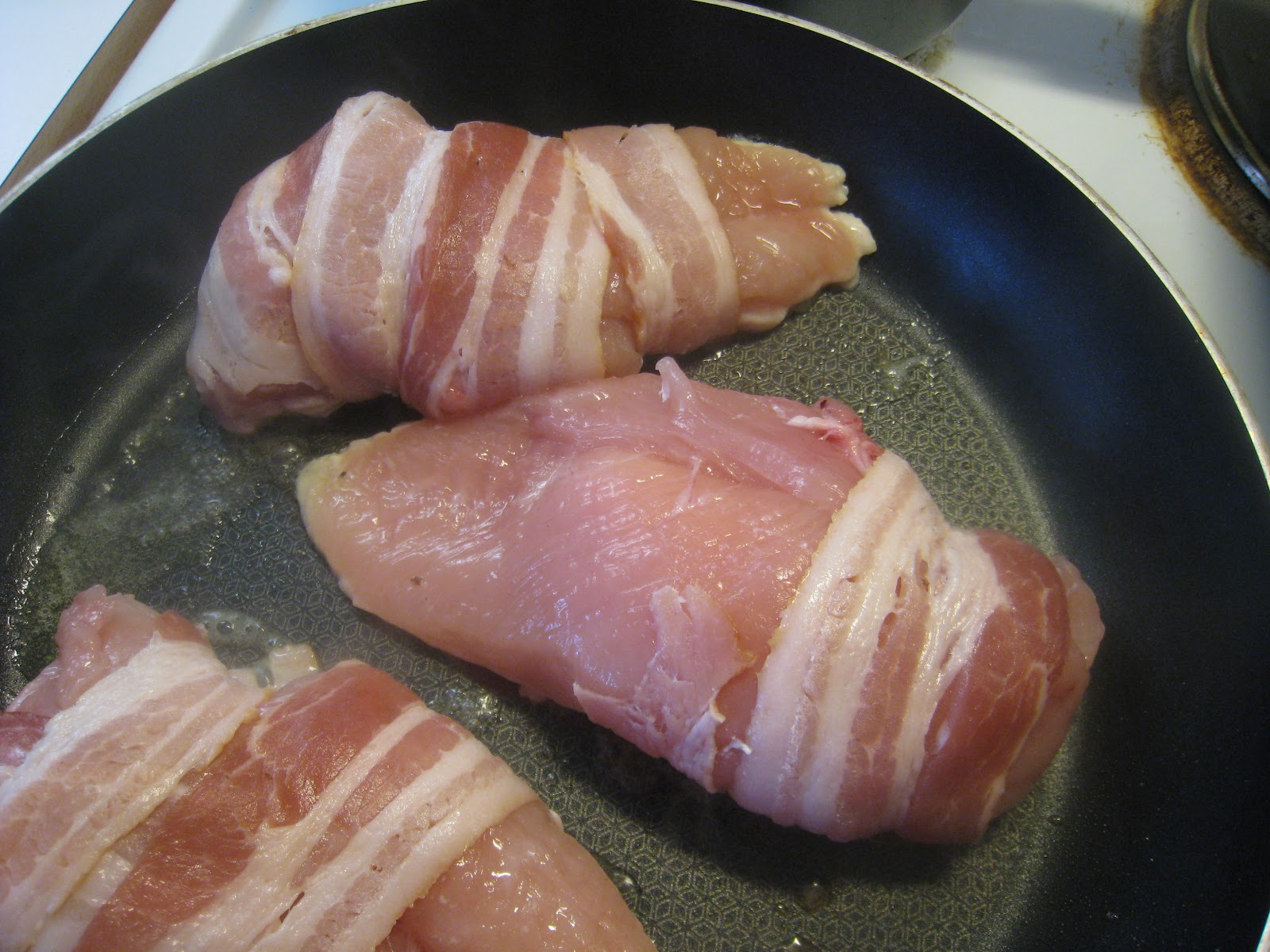 3. Kääri täytetyt fileet pekoniviipaleisiin, mieluiten niin, että pekoniviipale peittää taskun suun (minulla oli vähän vähemmän pekonia, joku oli ehtinyt putsata valtaosan paketista parempiin suihin). Paista kuumalla pannulla muutama minuutti molemmin puolin, kunnes pekoni ja näkyvissä oleva kanan pinta saavat hieman väriä.