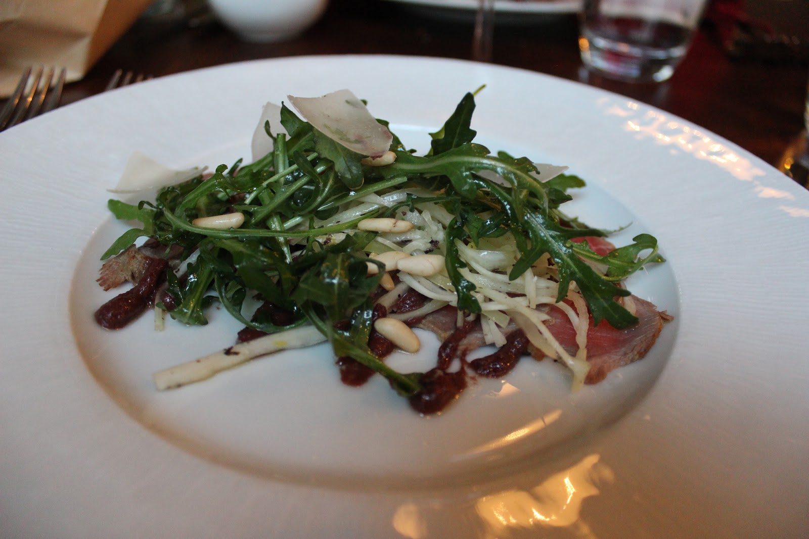 Valitsimme molemmat päivän menun, kolme ruokalajia sekä juustot 49e. Minua houkutteli myös sen ulkopuolinen päivän liha, joka olisi ilmeisesti ollut jänistä. Tässä kohtaa esitän vielä pahoitteluni siitä, jos unohdan tulevasta listauksesta jotain, tai jos jokin asia menee pieleen; vaikka kamera oli mukana, en kuitenkaan kirjoittanut ylös ihan kaikkea, mitä söimme. Niin, ja disclaimerin, että olen niin juntti, että suokaa anteeksi analyysin karkeus :) Anyway, suloisen leipäpussukan ja artisokkatahnan jälkeen meille tuotiin alkuruuaksi karitsan paahtopaisticarpaccio, jonka kaverina oli tapenadea, pinjansiemeniä, mustalla tryffelillä maustettua kaalisalaattia sekä rucolaa. Annos oli herkullinen, tosin karitsa niin mieto, että salaatti maistui melko voimakkaalta sen rinnalla.