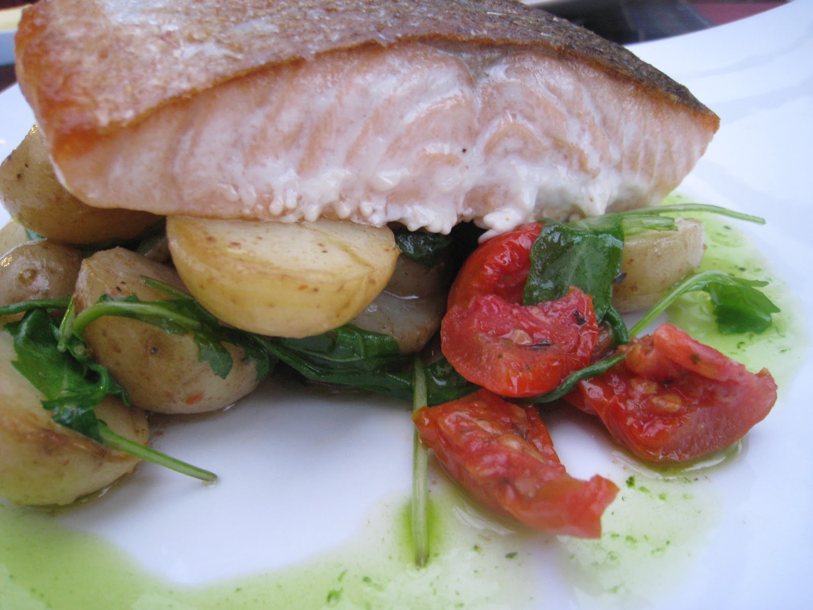 Myönnettäköön kuitenkin, matkan alkupuolella syöty lisuke ei enää viikko kotiinpaluun jälkeen ollut ihan tarkassa muistissa. Oliko se kylmää vai lämmintä? Oliko perunat paistettu vai höyrytetty? Koska muisti ei ihan pelannut ja oli lisäksi ristiriidassa isännän muistin kanssa, tein uusintaversion eri muistikuvia yhdistellen. Lopputulokseksi sain ihan kelpo yhdistelmän paistettua perunaa ja lämmintä perunasalaattia. Kotitekoisia kuivattuja tomaatteja ei ollut tällä kertaa varastossa, joten oikaisin käyttämällä kaupan puolikuivattuja (Ridderheimin muistaakseni) tomaatteja parmesan-pestoöljyssä, sain siitä tomaatin lisäksi myös yrttiöljyn.