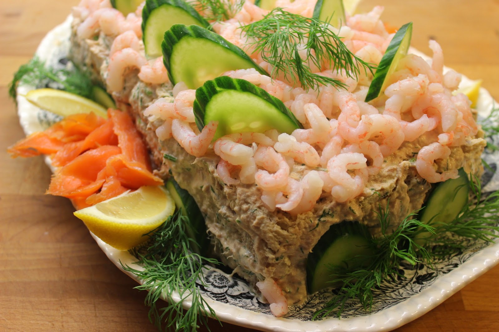 4. Anna kakun vetäytyä yön yli jääkaapissa. Koristele se ennen tarjoilua mieleiseesi tapaan esim. katkaravuilla, graavilohisiivuista tehdyillä ruusukkeilla, kurkkuviipaleilla ja tillillä.