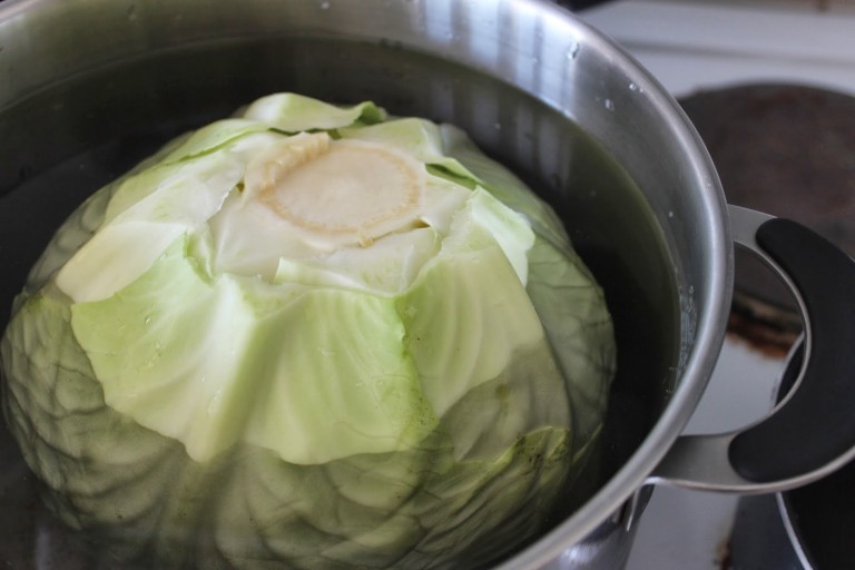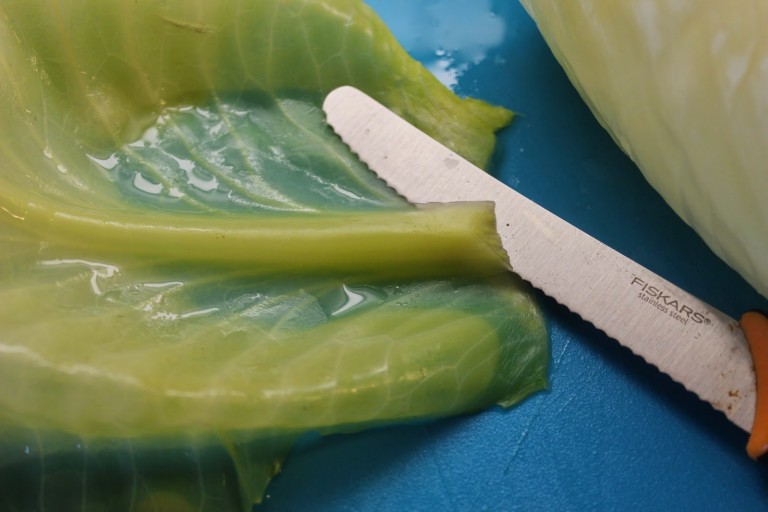 Oppitunti numero 1: Harkitse ylläolevaa, äläkä edes aloita. No mutta minähän aloitin, vaikka oppitunti numero 2: tarkista, että kaikki tarveaineet löytyvät huushollista, oli hoitamatta. Ei se mitään, ohrasuurimot voi toki vaihtaa riisiin. Matka jatkui, vaikka kaalin kannan kovertaminen oli odotettua haastavampaa. Olisiko olemassa sellaista, kuin kaalipora, jolla uusavuton saisi kannan poistettua ilman, että oheistuotteena valmistuu ihmisnakkeja? Mutta, oppitunti numero 3: älä rupea keittelemään kaalia ja riisiä sillä oletuksella, että lapsesi käy päiväunille kuten kuvittelet hänen käyvän. Juuri, kun kaali alkoi olla kiehumispisteessä, totesin parhaaksi lähteä nukuttamaan ihmispoikasta vaunulenkille. Kokkauksen pariin pääsin palaamaan kolmisen tuntia myöhemmin, kun lenkin jälkeen piti vielä syödäkin, sekä äidin että lapsen. Kaali oli hieman pehmennyt päältä ja sain ensimmäiset lehdet poistettua heti, sitten jatkoin keittelyä. Riisi oli jäänyt raa’aksi joten lisäsin siihenkin vettä ja keitin kypsäksi.